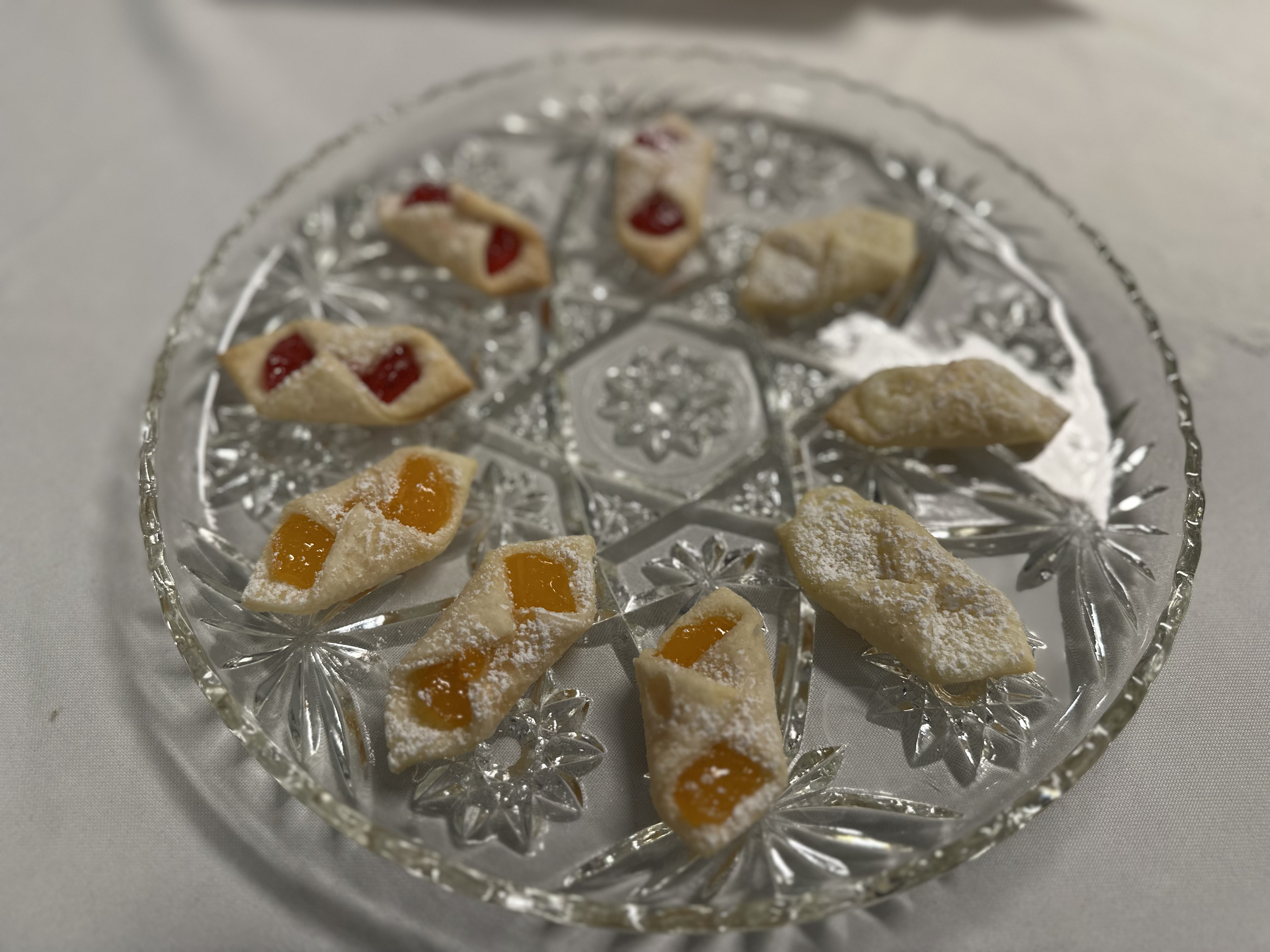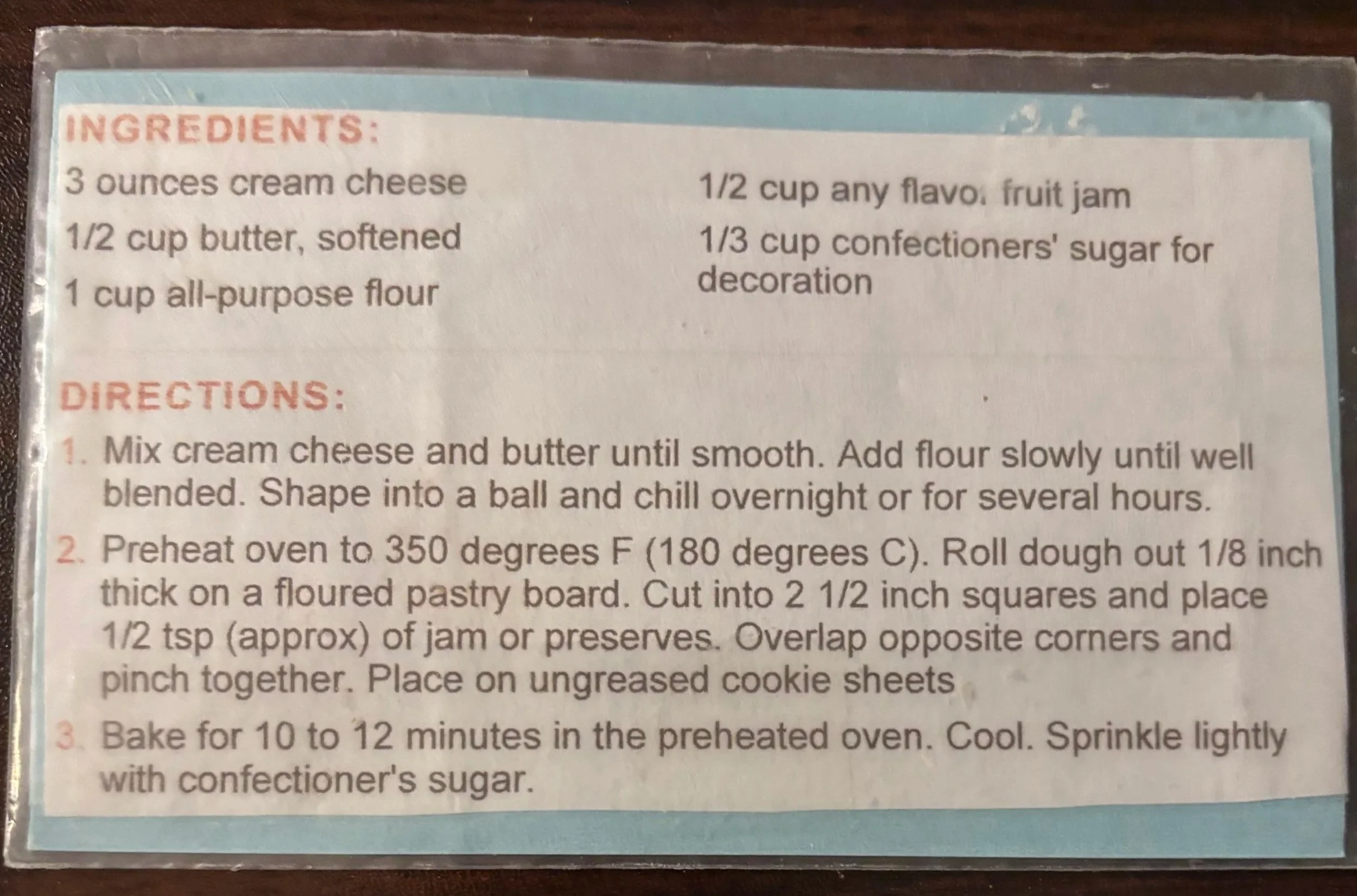 Preheat oven to 350 degrees F (180 degress C). roll dough out 1/8 inch thick on a floured pastry board. Cut into 2 1/2 inch squares and place 1/2 tsp (approx) of jam or preserves. Overlap opposite corners and pinch together. Place on ungreased cookie sheets.